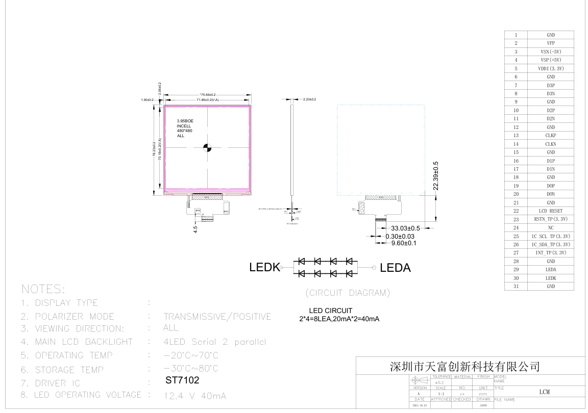 3.95 इंच लो-पावर आईपीएस पतला इन-सेल टच स्क्रीन मॉड्यूल | साफ़, टिकाऊ और बहुमुखी! 480 x RGB x 480 रिज़ॉल्यूशन और एक अल्ट्रा-स्मॉल 0.1462 मिमी पिक्सेल पिच से सुसज्जित, इसमें 16.7M असली रंग, 1200:1 उच्च कंट्रास्ट अनुपात और 500cd/m² चमक है, जो किसी भी देखने के कोण से बिना किसी रंग के स्पष्ट, स्पष्ट छवियां प्रदान करता है।